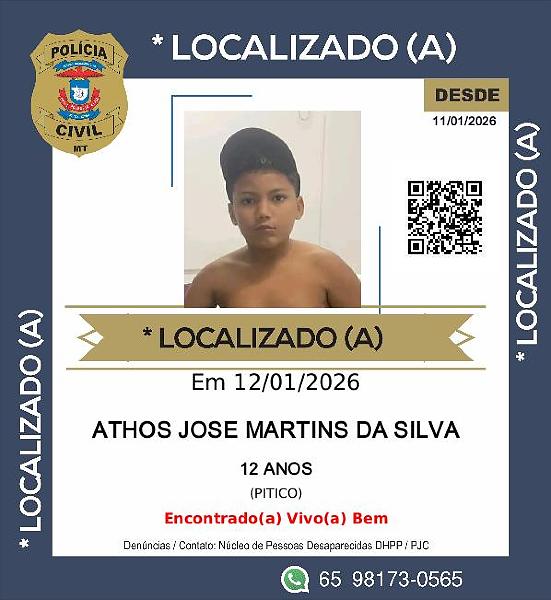 O adolescente Athos José Martins da Silva, de 12 anos, que estava desaparecido, foi encontrado e passa bem. A informação foi confirmada pelo Núcleo de Pessoas Desaparecidas nesta terça-feira (13).