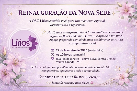 A Liga de Reestruturação das Irmãs Ofendidas no Seu Sentimento (LÍRIOS) realiza, nesta sexta-feira, 27 de fevereiro de 2026, a reinauguração de sua nova sede, em Várzea Grande. A organização da sociedade civil atua alinhada aos Objetivos de Desenvolvimento Sustentável (ODS) da Agenda 2030 da ONU e desenvolve iniciativas nas áreas de educação, saúde, inclusão social, prevenção da violência, sustentabilidade e economia solidária e circular.
