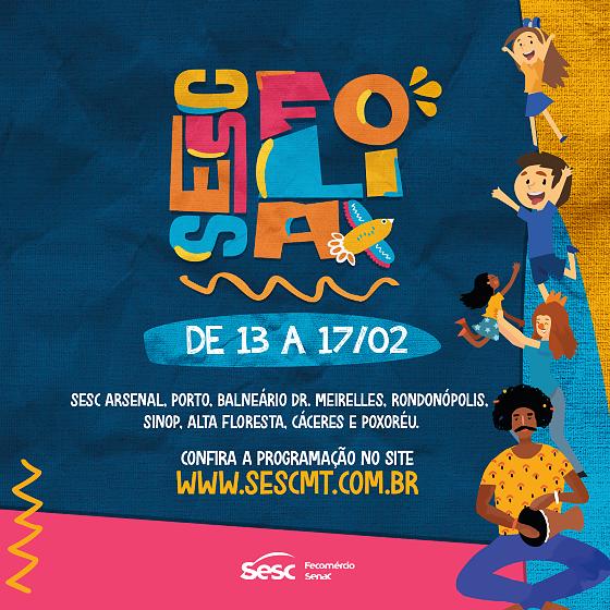 O Sesc-MT realiza mais uma edição do Sesc Folia, com uma programação especial de Carnaval entre os dias 13 e 27 de fevereiro, movimentando as unidades de Cuiabá (Sesc Arsenal, Porto e Balneário Dr. Meirelles), Alta Floresta, Cáceres, Rondonópolis, Poxoréu e Sinop.
