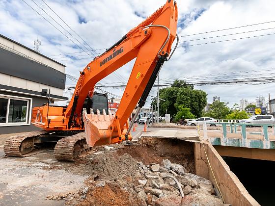 A Secretaria Municipal de Infraestrutura e Obras Públicas também atua na recuperação de um buraco na pista, localizado a alguns metros da ponte. Com o apoio de maquinários, a equipe verifica as causas do problema para adotar as medidas necessárias.