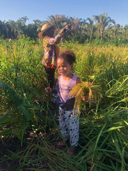 Com ela foi assim. Desde os dois anos de idade, ia para a roça com os avós para aprender a plantar milho, arroz e mandioca. “Dessa época, lembro eu, pequenininha, jogando as sementes de milho na terra e as enterrando com os pezinhos. Minha vó falava: ‘não é pra jogar um monte de sementes. São apenas três por buraco’”, recorda com carinho.