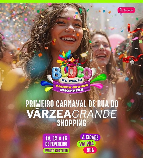 Pela primeira vez em Várzea Grande, o coração da cidade se transformará em um autêntico circuito carnavalesco a céu aberto. O Várzea Grande Shopping, com apoio da Secretaria Municipal de Desenvolvimento Econômico, Tecnologia e Turismo (SMDETT), promove neste domingo (15) o seu primeiro carnaval de rua na Avenida Sen. Filinto Müller. A partir das 16h, o asfalto dará lugar ao ritmo da Bateria Banana da Terra e ao pagode de Flavinho e Klevinho.