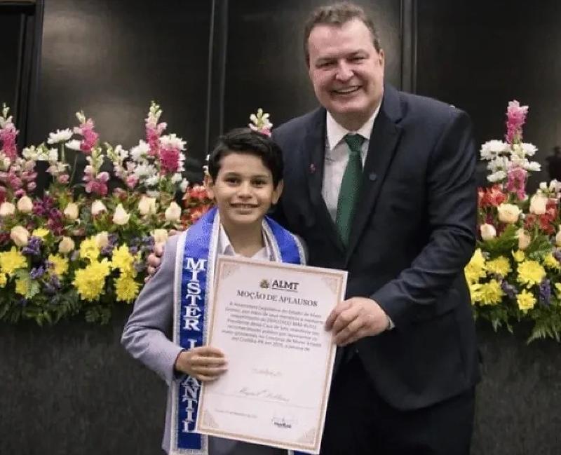 O talento e o protagonismo do jovem Miguel Dobbins, de apenas 10 anos, foram reconhecidos oficialmente pela Assembleia Legislativa de Mato Grosso (ALMT). Detentor do título de Mister Infantil Mato Grosso 2026, Miguel recebeu uma moção de aplausos das mãos do presidente da Casa, deputado Max Russi (PSB), durante sessão especial realizada nesta quarta-feira (17), no Plenário das Deliberações Deputado Renê Barbour.