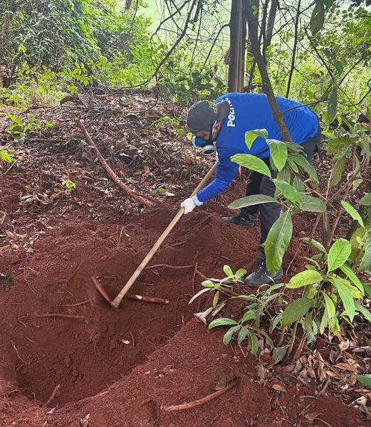 Durante trabalho de busca e varredura no local, o cão farejador sinalizou um ponto suspeito e passou a cavar o solo. Em seguida foi realizada a escavação e encontrado um cadáver com característica compatível com a da vítima desaparecida.