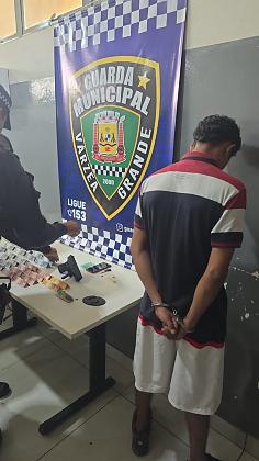 Durante a revista pessoal, os guardas encontraram um simulacro de arma de fogo na cintura do suspeito, que já possui passagens por tráfico de entorpecentes. Questionado sobre a ausência da placa da motocicleta, ele afirmou que havia retirado o item e o guardado no compartimento do veículo.