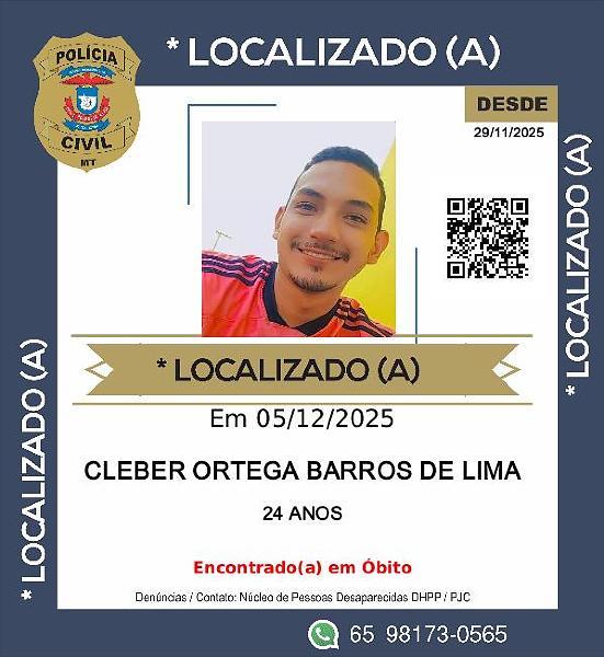 A Polícia Civil confirmou, nesta terça-feira (9), a identidade do homem encontrado morto no dia 3 de dezembro, em uma área de zona rural nas proximidades do loteamento Juca do Guaraná, em Cuiabá. A vítima foi identificada como Cleber Ortega Barros de Lima, de 24 anos, por meio de confronto odontológico realizado pela Perícia Oficial e Identificação Técnica (Politec).