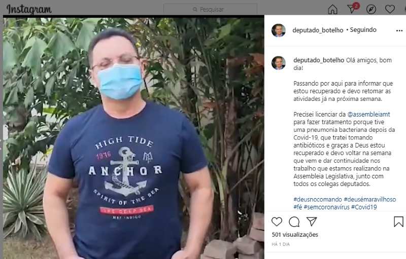 "Bom dia a todos quero comunicar os senhores que eu estou voltando na semana que vem à Assembleia. Fui fazer um tratamento por conta de uma pneumonia bacteriana, depois que tive a Covid-19. Já tratei, tomando antibióticos e, graças a Deus, estou recuperado. Assim, devo voltar na semana que vem e dar continuidade nos trabalhos que estamos realizando na Assembleia Legislativa, junto com todos os colegas deputados".