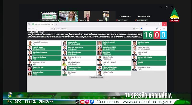A Câmara de Cuiabá aprovou com 18 votos favoráveis, uma moção de repúdio à decisão do Tribunal de Justiça de Minas Gerais (TJMG) que absolveu, por maioria, um homem acusado do crime de estupro de vulnerável contra uma menina de 12 anos. A moção foi proposta pelo vereador policial federal Rafael Ranalli (PL). Ranalli que é presidente da Comissão da Criança e do Adolescente pede que a moção seja encaminhada ao próprio TJ mineiro, ao Ministério Público de Minas Gerais e ao Conselho Nacional de Justiça (CNJ) para conhecimento e adoção de providências.